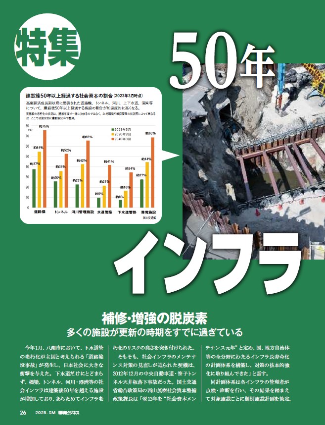 インフラ老朽化/環境経営をイチから成功させる方法・富士通/サステナ推進・座談会/環境配慮型経営・ちとせグループ/【特集】インフラ老朽化/【特集】道路の脱炭素/【特集】需要増に応える主力蓄電池/大阪・関西万博レポート